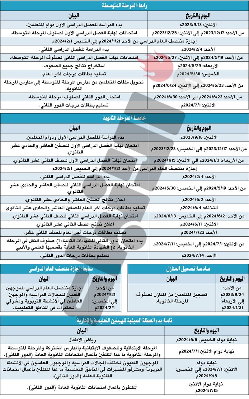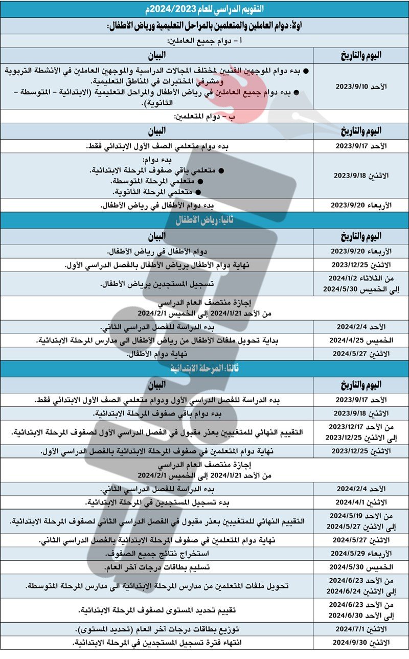 وذكر التقويم أن عطلة منتصف العام تبدأ من الاحد 21 يناير وتنتهي يوم الخميس 1 فبراير 2024 ، على أن تبدأ امتحانات نهاية العام الدراسي لطلبة يونيو 2024م.