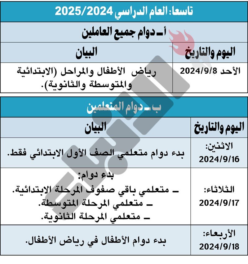 التقويم الدراسي 2024 في الكويت حيث حددت وزارة التربية أن يكون بدء الدوام لجميع العاملين في المدارس بمراحلها المختلفة يوم الاحد 10 سبتمبر المقبل ويوم 17 من نفس الشهر بدء دوام تلاميذ الأول الابتدائي، على أن يلتحق بقية زملائهم في المراحل التعليمية الابتدائية والمتوسطة والثانوية يوم الاثنين 18 سبتمبر، بينما سيكون موعد دوام رياض الأطفال يوم الأربعاء 20 منه.